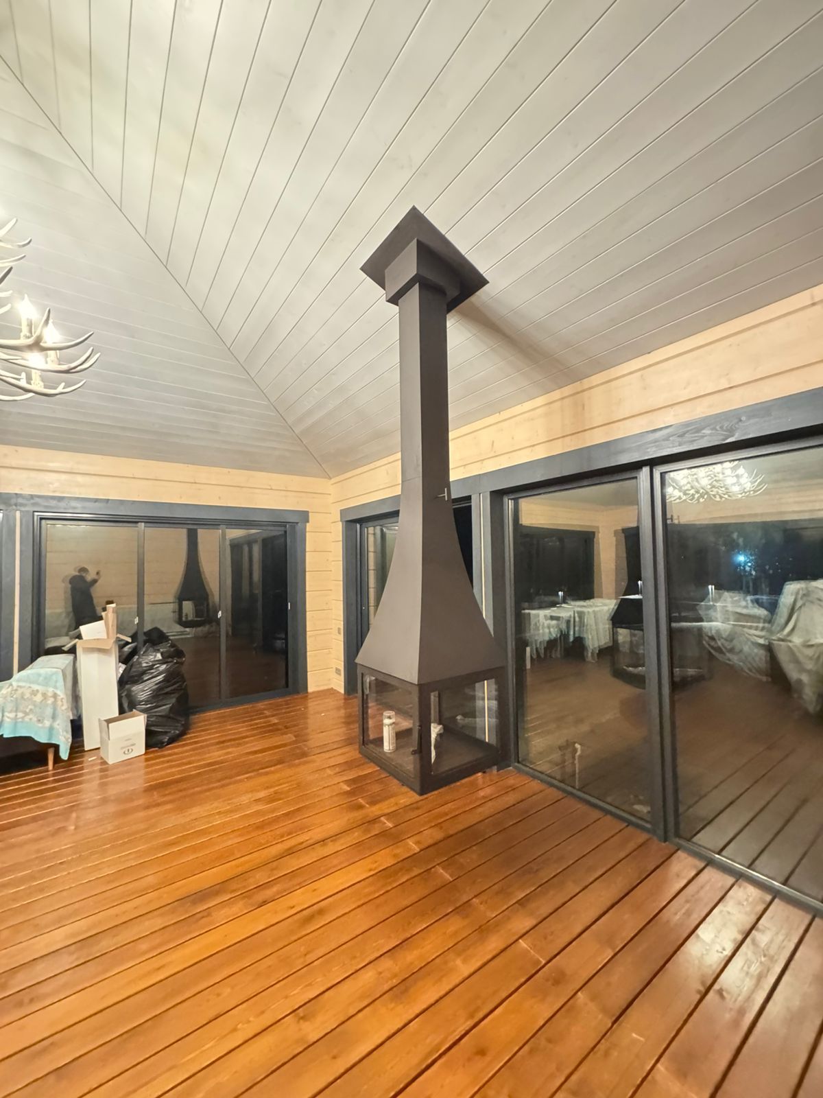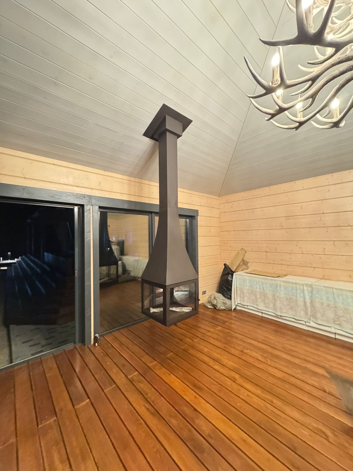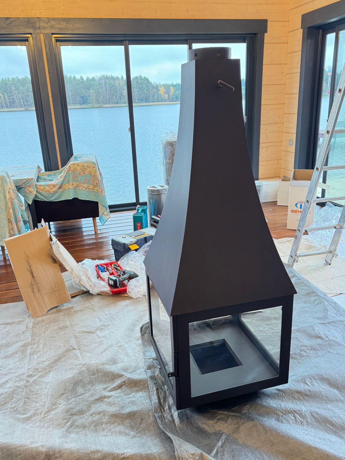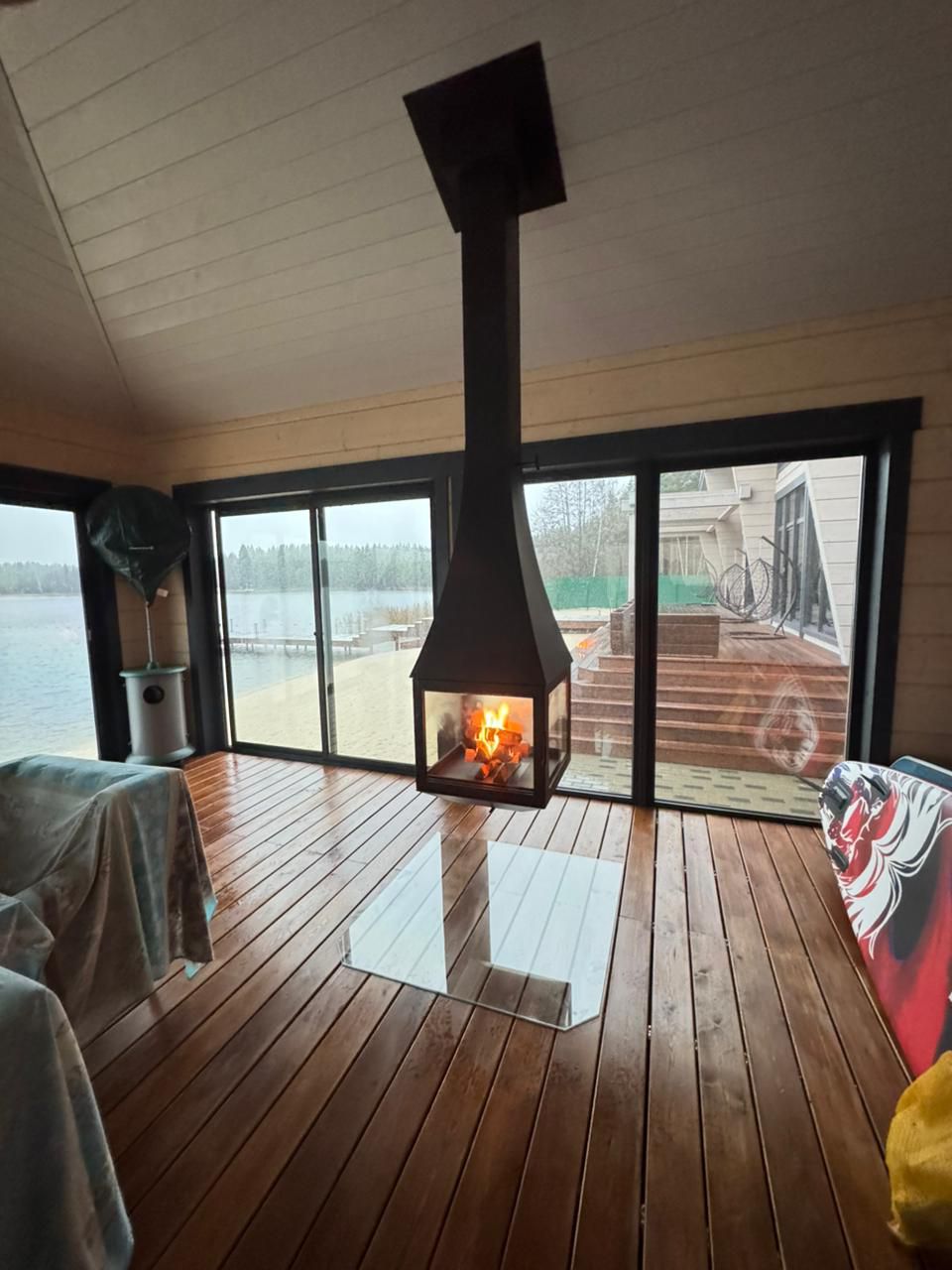 Интересной особенностью камина является его остекление – оно панорамное. Нижняя часть держится на боковых ребрах к которым крепятся стекла. В результате обзор пламени, как и установка самого камина возможны абсолютно с любой точки помещения.
